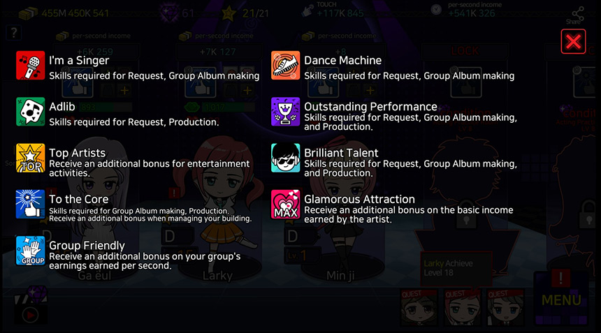 수입을 벌 수 있는 각 활동에는 아티스트의 특기에 따라 수익에 대한 보너스를 받을 수 있으므로